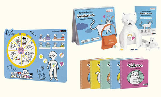 On comprend ensuite par l'histoire. Les aventures de Voltaire le chat, notre petit héros, font passer les émotions de l'ombre à la lumière, avec humour et poésie. Grâce à lui, les enfants mettent des mots sur ce qu'ils ressentent, et découvrent des stratégies de régulation qui les aident au quotidien.