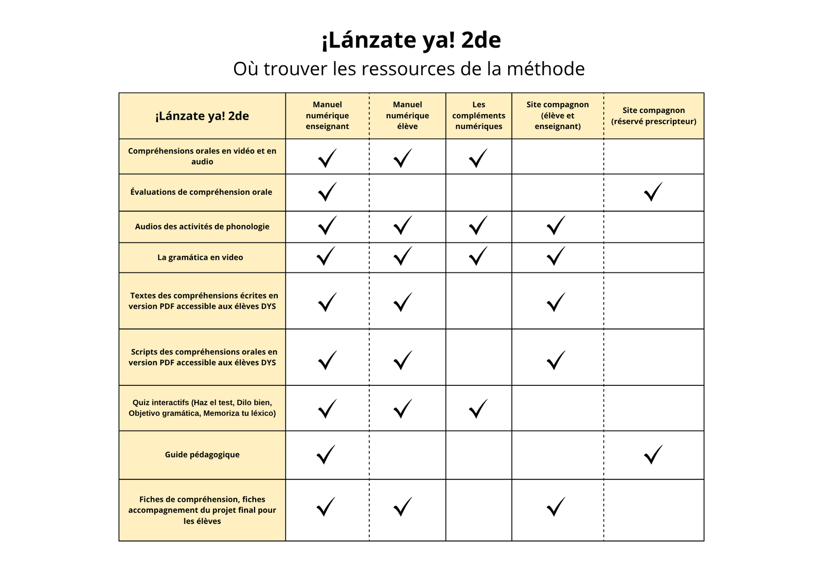 Il n’y a pas de cahier ¡Lánzate ya! 2de mais des fiches accessibles directement via les QR codes et mini liens ou depuis le manuel numérique (enseignant et élève) sous forme de fichiers PDF téléchargeables. Ces fiches sont de deux types :