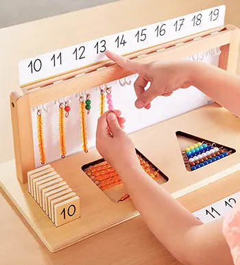 Pour prendre conscience de la notion de rang, essentielle à la compréhension mathématique. L’enfant construit les nombres de 10 à 19 en percevant la permanence de la dizaine et l’augmentation des unités.