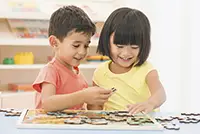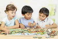 Un enfant commence à réaliser ses premiers puzzles et encastrements simples dès l’âge de 18 mois – plus souvent à partir de 2 ans. C’est une activité calme et valorisante dans laquelle les enfants éprouvent du plaisir à faire, défaire, refaire un grand nombre de fois les mêmes agencements, qu’ils finissent souvent par connaître par cœur, par un processus d’essai-erreur. Ils s’exercent à les réaliser de plus en plus rapidement, sans hésiter sur le choix des pièces, leur orientation et le positionnement de chaque élément dans l’ensemble. La satisfaction d’avoir réalisé l’activité est d’autant plus grande qu’ils peuvent mesurer eux-mêmes leur réussite et être responsables du rangement lorsqu’un puzzle est achevé.