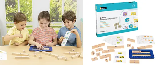 Debloki peut facilement être manipulé pendant que le problème est lu. Chaque manipulation demande un contrôle par l’enfant de ce qui se passe dans l’énoncé, et cela est facilité par la consultation des fiches d'énoncés de problèmes.