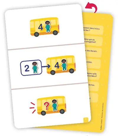 Les fiches sont un puissant élément de différenciation et de remédiation pour les enfants qui ont besoin de se remémorer et de reformuler l’histoire. Ils aiment beaucoup s’en servir en racontant eux-mêmes l’énoncé. C’est un moyen de les aider à produire à l’oral un énoncé mathématique. L’accompagnement par l’enseignant(e) est essentiel.