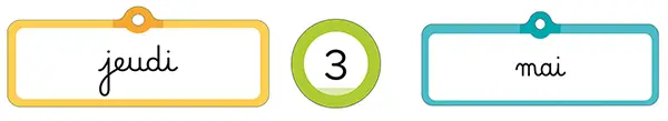 Lorsque les élèves ont acquis suffisamment d’autonomie dans l’établissement de la date du jour (Jour Chiffre Mois), le rituel de l’écriture de la date leur permet de s’entraîner à écrire à l’aide d’étiquettes, puis en capitales (et en cursives éventuellement). Ils s’entraînent aussi à l’écriture des chiffres qui est similaire à celle des capitales d’imprimerie.
