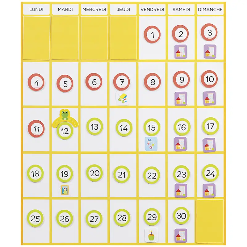 En petite section, les élèves apprennent à se repérer dans une journée. Ils deviennent capables de situer le matin, le midi, l’après-midi et de structurer quelques moments forts de la journée (récréation, cantine, sport…). Lorsqu’ils grandissent, ils apprennent le nom des jours et commencent à se repérer dans la semaine. Les journées deviennent des jours précis et l’organisation des semaines constitue les mois de l’année. Tenir le calendrier de la classe permet d’accompagner les enfants dans la mise en place des premiers repères sociaux que sont les jours de la semaine, de mettre en lumière leur aspect cyclique et de marquer visuellement leur passage (ou l’avancée du temps dans le mois).
