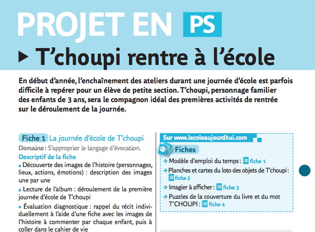 En début d'année, l'enchaînement des ateliers durant une journée d'école est parfois difficile à repérer pour un élève de petite section. T'choupi, personnage familier des enfants de 3 ans, sera le compagnon idéal des premières activités de rentrée sur le déroulement de la journée.