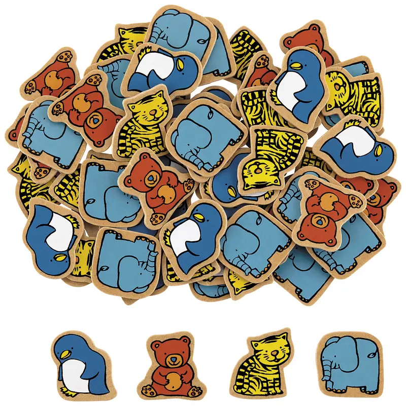 - 40 jetons en bois : 15 éléphants, 5 pingouins, 5 tigres, 15 oursons (5,5 x 4,5 cm).