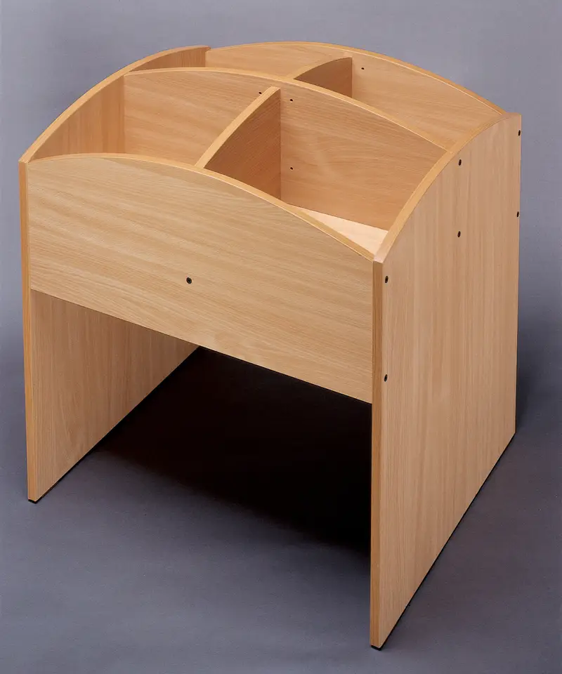 Bac à livres 4 cases bas (teinte hêtre), monté sur roulettes pour ranger des ouvrages.