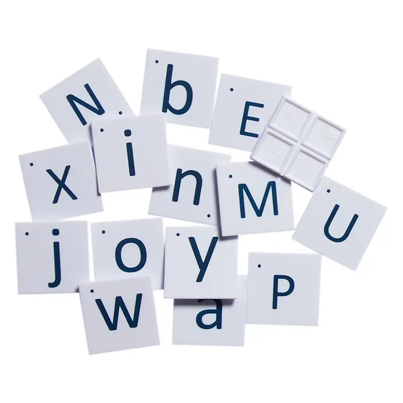 - 52 lettres mobiles : 26 lettres en capitales et 26 lettres recto verso en script et en cursives (L/l/ép. lettre : 7,5 x 7,5 x 0,4 cm).