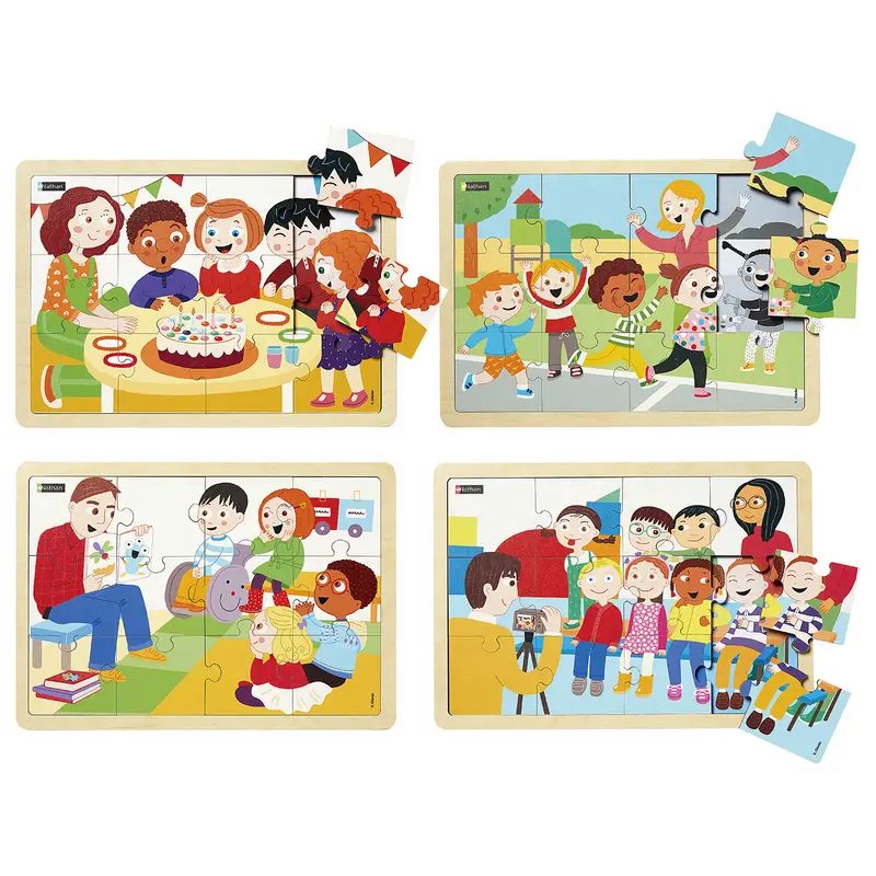 Un puzzle de 12 pièces en bois sur le thème de la photo de classe.