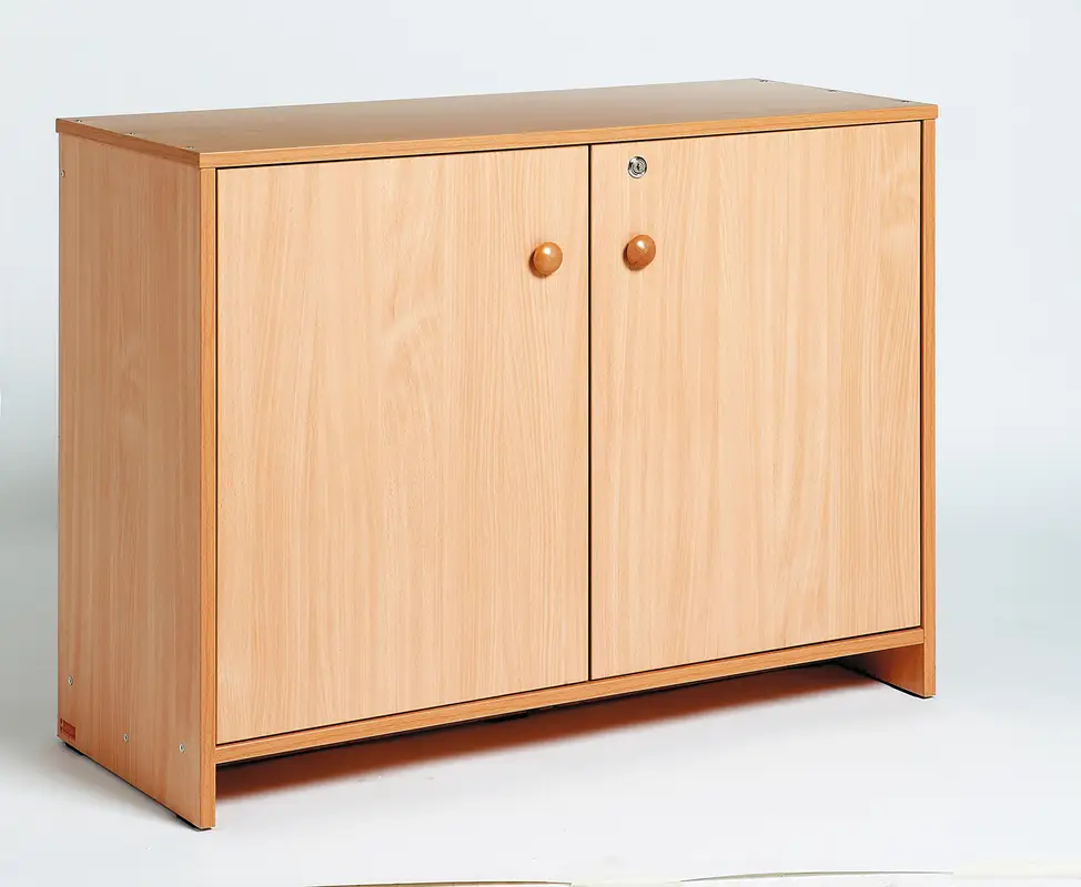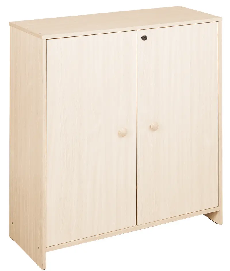 Meuble d'activités à étagères (teinte hêtre) conçu pour faciliter la mise en place des ateliers individuels et des jeux libres en toute autonomie.