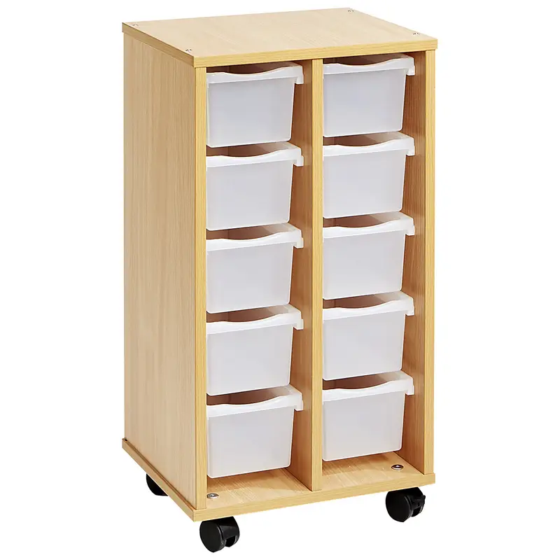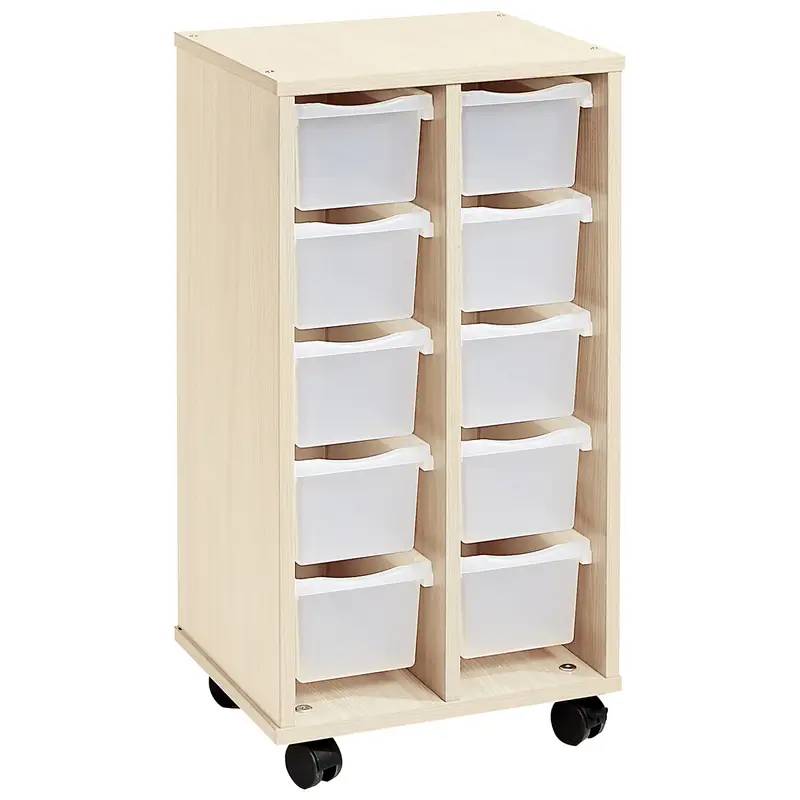 Un meuble haut (teinte bouleau) livré avec 10 bacs plats et 10 bacs profonds incolores. Il est idéal pour ranger le matériel en vrac, les jeux de construction, les fournitures.