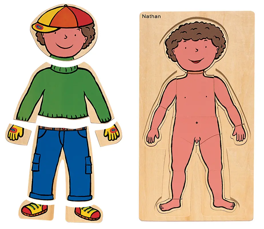 Place les vêtements pour habiller Bob ! Un jeu en bois magnétique pour favoriser la découverte du schéma corporel.