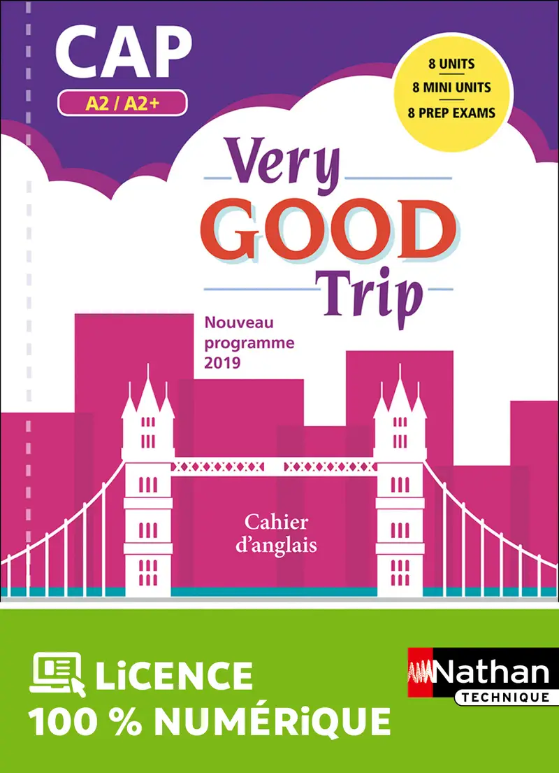 Ce cahier d’Anglais Very Good Trip, permet une mise en activité motivante et interactive de vos élèves à l’aide du numérique. Il a été conçu pour un apprentissage concret et progressif de la langue vivante en CAP (niveau A2/A2+). Par la variété de ses supports et de ses démarches, il s’adresse à des élèves préparant un CAP en 1, 2, ou 3 ans.