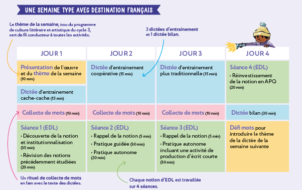 Une organisation hebdomadaire claire détaillée jour par jour.