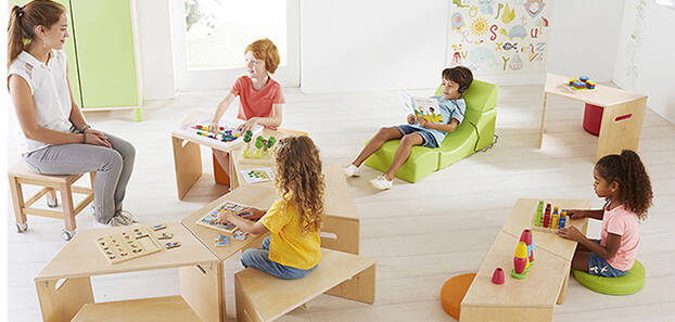 Notre mobilier de regroupement offre une grande souplesse d’agencement pour créer des espaces accueillants et confortables, dans lesquels les enfants se sentent bien.