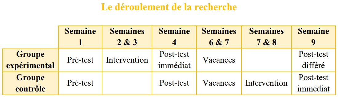 Après deux semaines de vacances, les enfants du groupe contrôle étaient soumis à leur tour au programme d'entraînement puis à un post-test immédiat. A ce moment-là, les enfants du groupe expérimental étaient à nouveau post-testés. Ce post-test constituait donc pour eux un post-test différé prenant place un mois après la fin de leur entraînement.