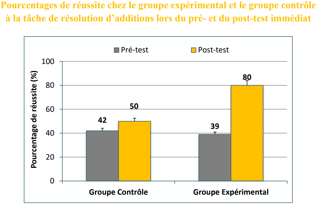 Cette impressionnante progression des enfants du groupe expérimental en termes de performance aux additions perdurait dans le temps puisque, au post-test différé, le pourcentage de réussite était encore de 78% (contre 80% en post-test immédiat).