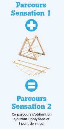 Ces parcours Sensation proposent des activités de déplacement, de grimpe et d’escalade sollicitant des prises d’appui inhabituelles : grimper à l’aide de barreaux pleins ou tronqués, escalader avec des prises en creux ou en volume, enjamber un sommet, se déplacer en quadrupédie (mains/pieds) sur une échelle inclinée, franchir des obstacles, glisser sur une rampe…