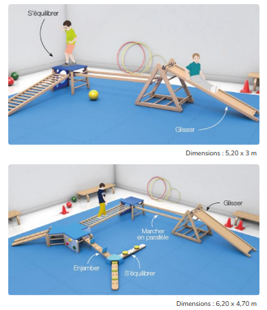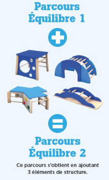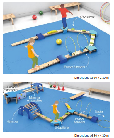 Ces parcours bas permettent de développer l’équilibre en jouant sur les déplacements (marche avant, arrière, latérale, etc.), les appuis et les surfaces d’évolution grâce aux accessoires amovibles (bosse, bascules, obstacles, cerceaux).