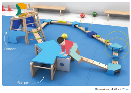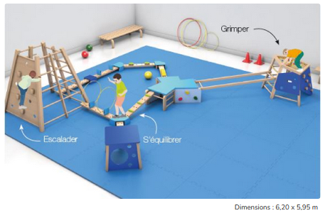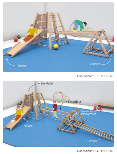 Ce parcours à choix multiples combine des situations mettant en jeu des déplacements variés (escalader, grimper, sauter, etc.), des appuis stables et instables, des équilibres bas et en hauteur, des franchissements d’obstacle, des changements de direction...