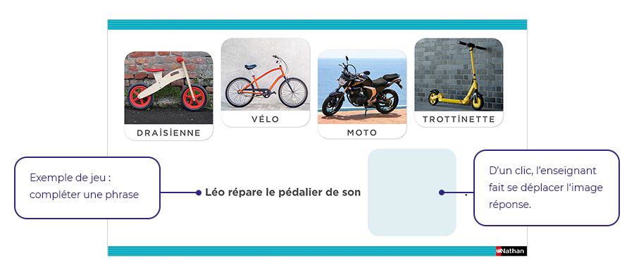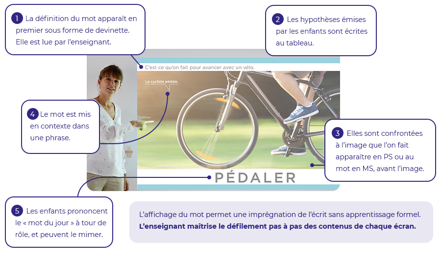 Chaque jour, grâce au diaporama animé, les enfants découvrent un ou deux mots nouveaux et de nombreux mots associés. L’enseignant maîtrise l’apparition pas à pas de chaque contenu.