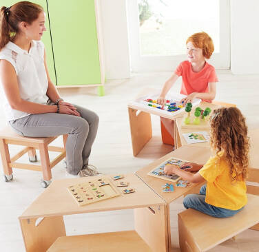 En pratique, l’enfant peut jouer debout ou réaliser une activité au sol sur un tapis, lire assis sur un pouf ou allongé en position de détente, écrire assis à une table ou debout sur un support incliné…