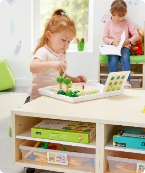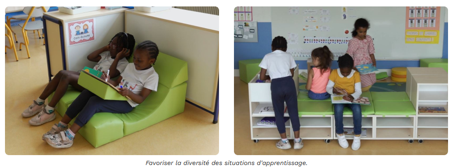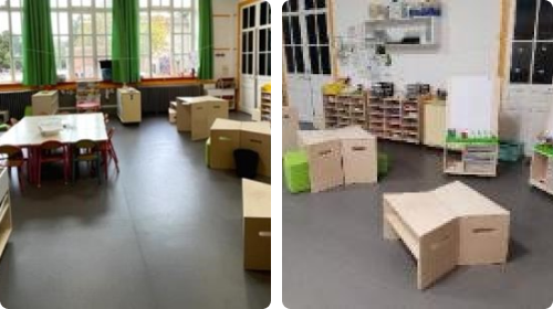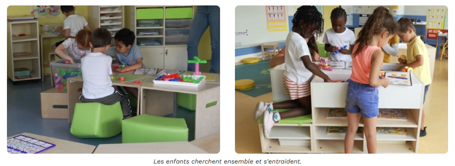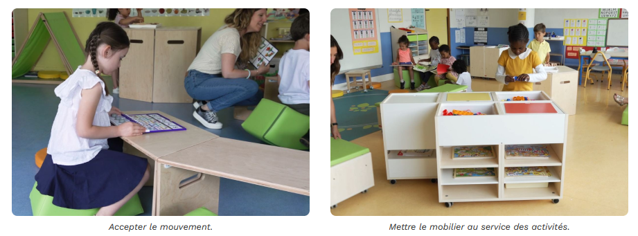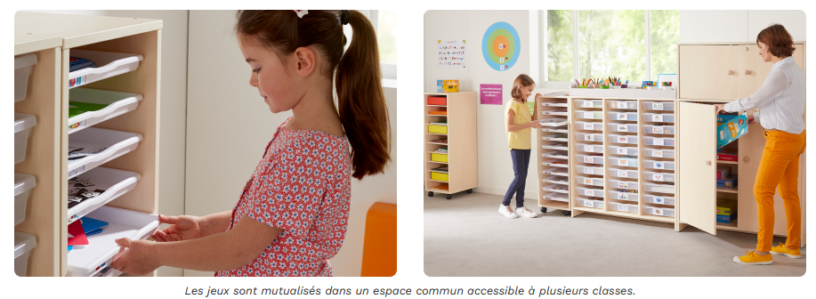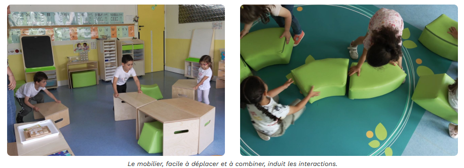 Induire les situations de jeux par l’aménagement en associant meubles et matériel pédagogique.