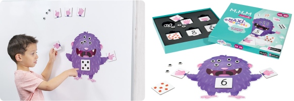 - Le monstre à compter, illustré sur l'une des faces des ardoises magnétiques, présente la particularité de pouvoir compter avec ses mains, ses yeux mobiles et les cartes à placer sur son ventre.